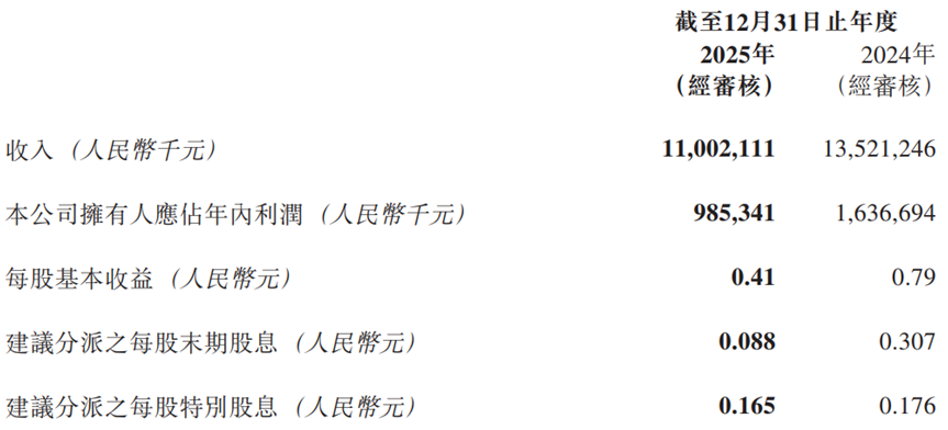 华润饮料2025年业绩报告显示,全年实现营业收入110.02亿元,同比下降18.6%;归母净利润9.85亿元,同比大幅下滑39.8%;每股基本收益0.41元,较2024年的0.79元近乎腰斩。