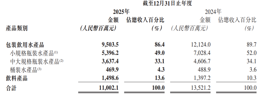 作为华润饮料的核心支柱,包装饮用水业务的表现直接决定了公司整体营收走势。财报显示,2025年,公司包装饮用水产品实现收入95.04亿元,同比下降21.6%,占总营收的86.4%,尽管仍是营收主力,但同比降幅显著高于整体营收降幅,成为拖累营收的主要因素。