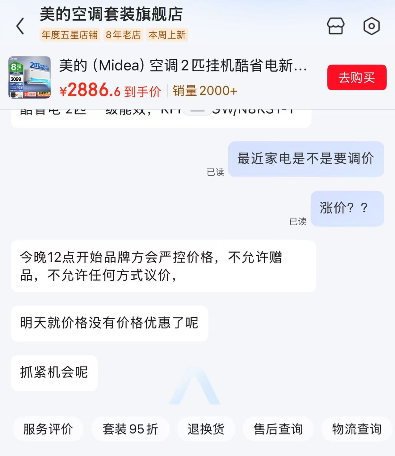 4月1日,界面新闻询问美的、海尔、西门子等线上旗舰店,京东美的空调套装旗舰店客服表示,“今晚12点开始品牌方会严控价格,不允许赠品,不允许任何方式议价。”此举也意味着部分产品将变相涨价。海尔和西门子天猫与京东旗舰店的客服表示“目前还没有接到调价通知”。