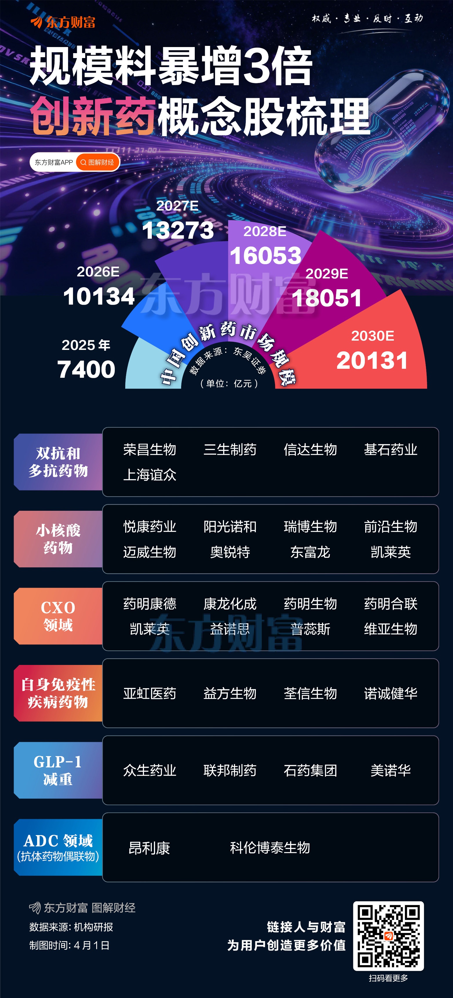 周三(4月1日)创新药概念大涨,睿智医药、艾迪药业、益方生物等20CM涨停,百利天恒、荣昌生物、君实生物等涨超10%。