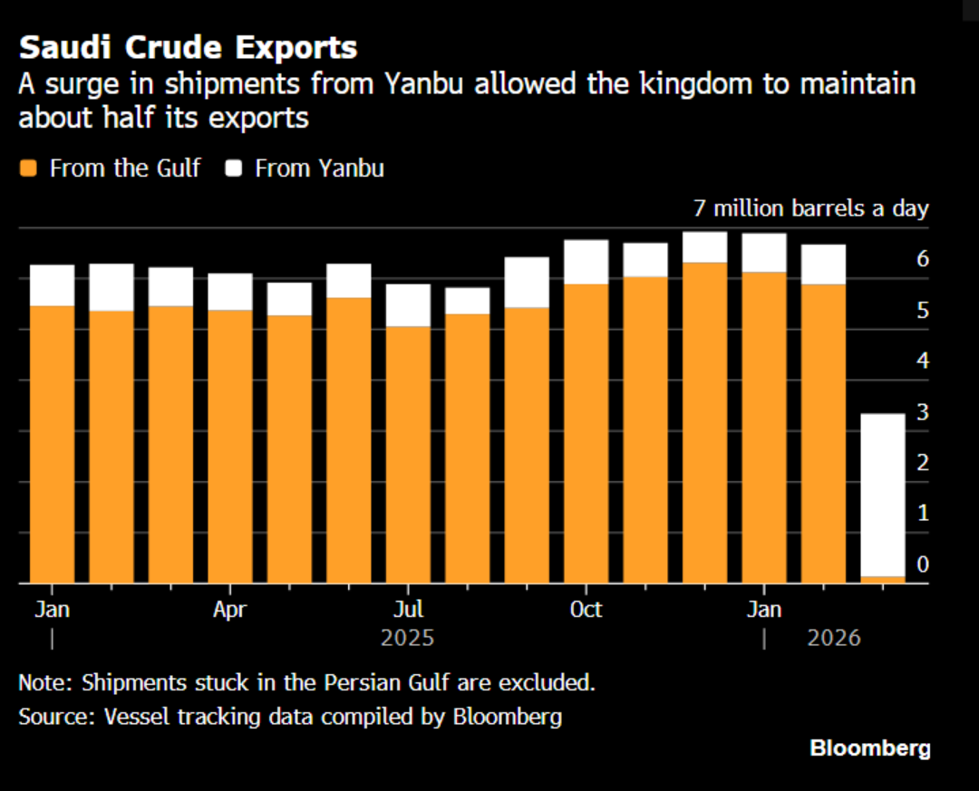油轮跟踪数据显示,3月出口量平均为每日333万桶。如果沙特未能将原油转运至红海出口终端,降幅本将更大。沙特是全球关键原油供应国,约每六桶通过油轮运输的原油中就有一桶来自该国。自伊朗事实上封锁中东出口国通往公海的通道以来,市场一直关注沙特维持出口的能力。数据显示,2月平均原油出口量为每日666万桶。上述两个月的数据均不包括已装船但仍滞留在波斯湾的货物。