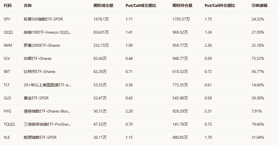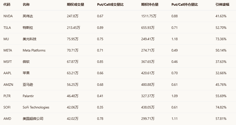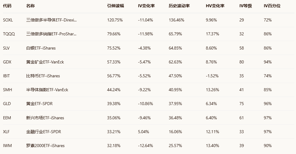 引申波幅排行榜(标的市值>10亿美元,且期权成交量>10万)