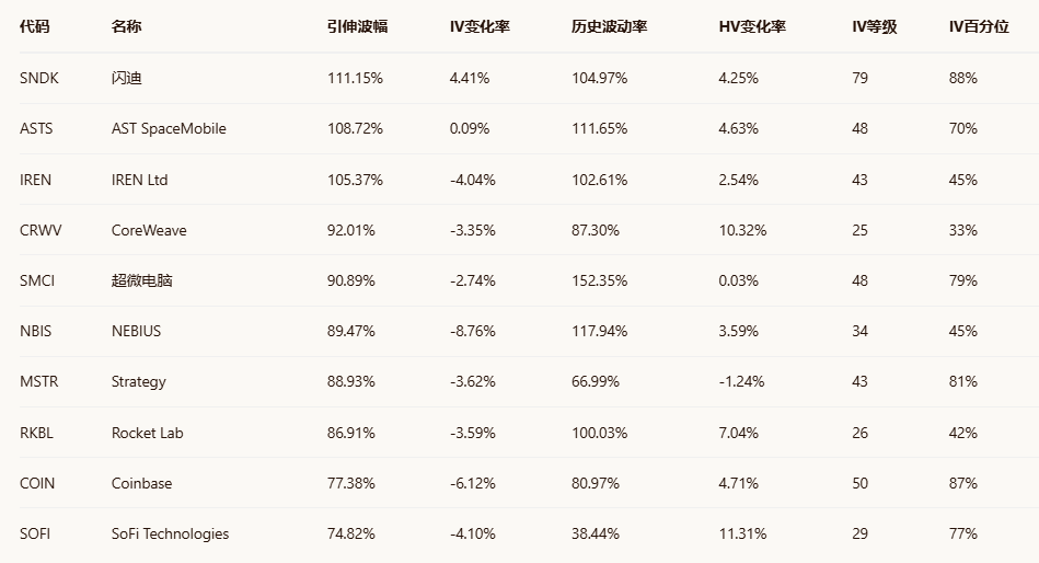 闪迪隐含波动率最高,达到111.15%,较上一交易日增长4.41%。闪迪受益于存储芯片需求增长和价格上涨预期股价大幅上涨。