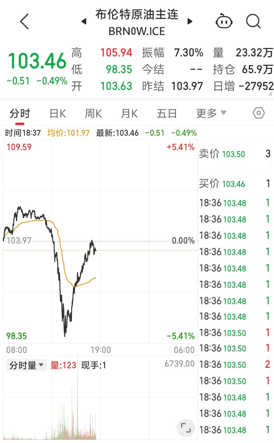 布伦特原油期货一周以来首次跌破每桶100美元,盘中一度大跌5%,而盘后,国际原油期货触底回升,截至发稿布伦特原油重回103美元/桶。