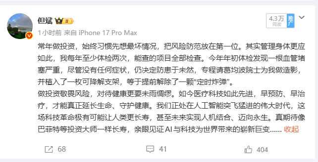 【导读】知名投资人但斌提醒大家注意身体健康