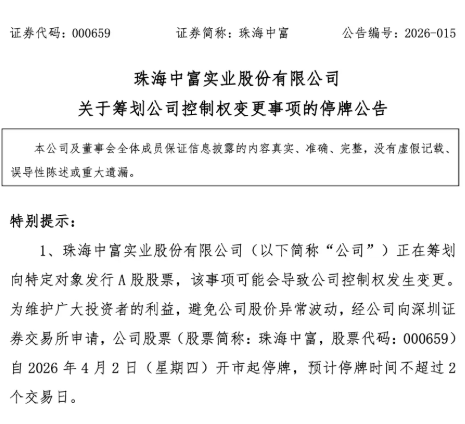 4月1日晚,珠海中富(000659)公告称,正在筹划向特定对象发行A股股票,该事项可能会导致公司控制权发生变更。为维护广大投资者的利益,公司股票自4月2日开市起停牌,预计停牌时间不超过2个交易日。