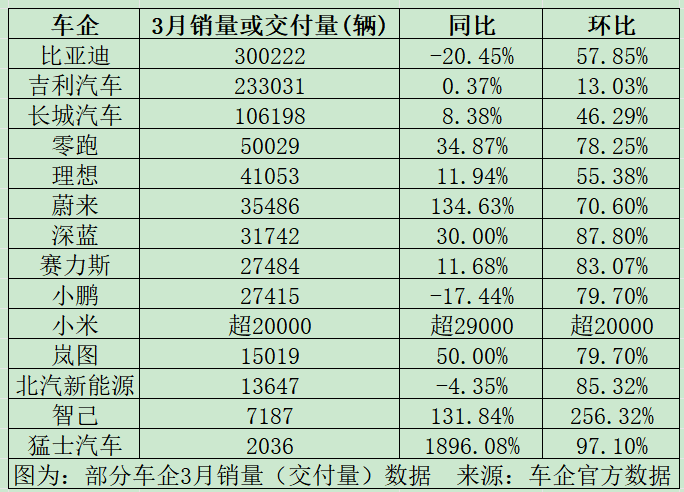 4月1日晚间,多家车企披露的3月销量(交付量)凸显暖意,其中比亚迪反超吉利汽车,月度销量再次迈过30万辆大关。