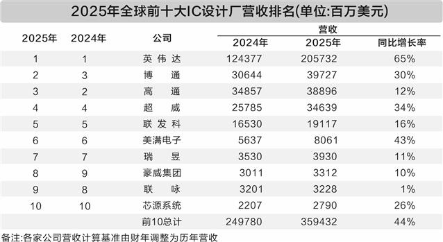 受人工智能(AI)浪潮推动,全球前十大芯片设计企业营业收入水涨船高。据统计,2025年全球前十大IC设计公司合计营收超3594亿美元,同比增长44%,英伟达蝉联营收冠军,博通反超高通成为第二名。另外,A股IC设计龙头豪威集团排名提升至全球第八名。