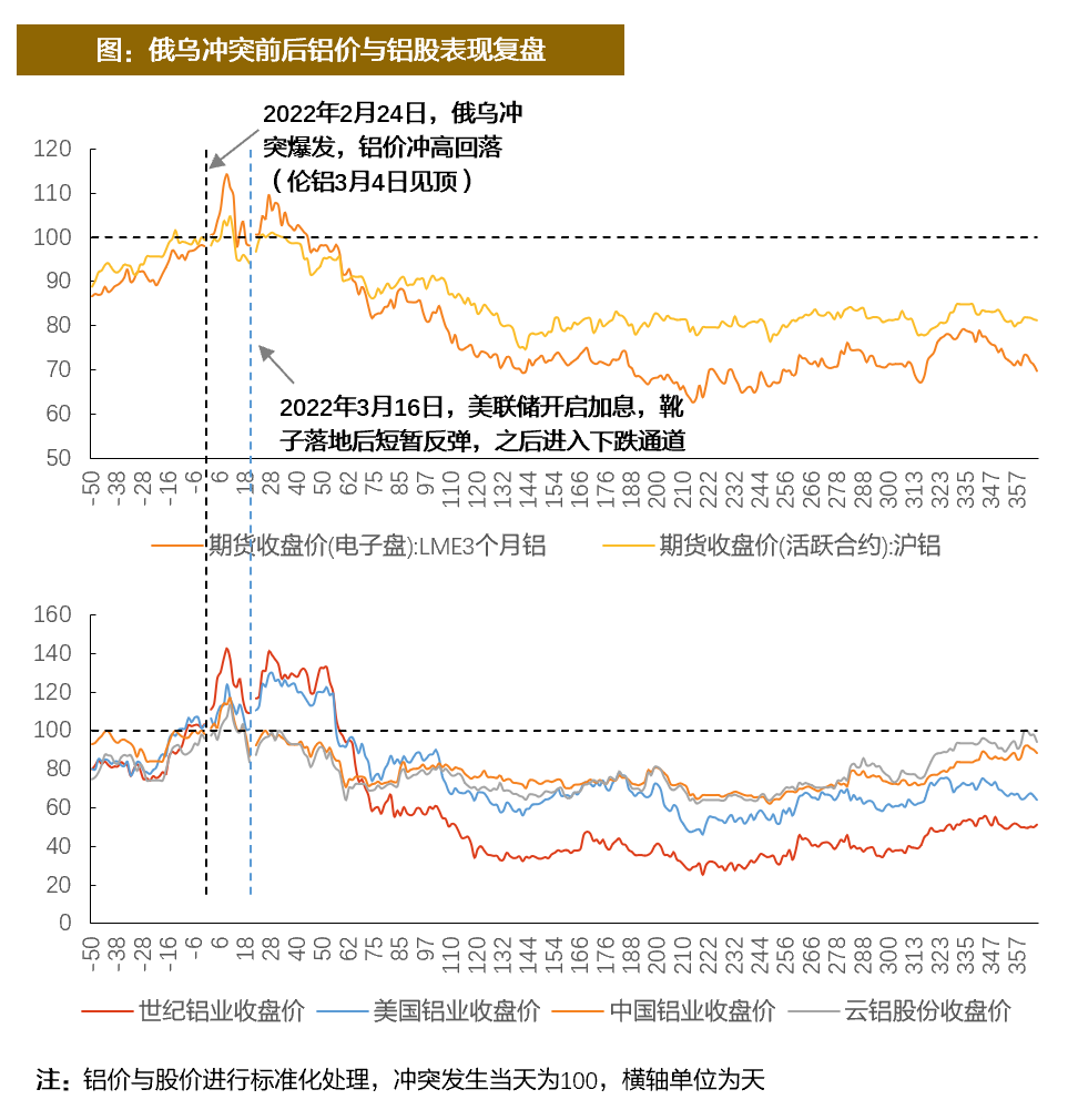 权益端:俄乌冲突爆发后基本与铝价同时反应,且弹性高于铝价,外盘股票表现更强;在加息周期中同样大幅回落。