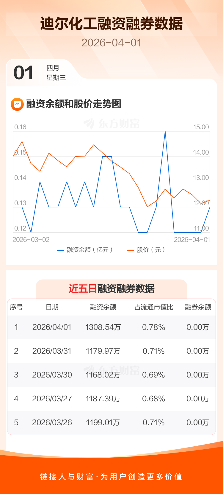 交易所最新数据显示,迪尔化工于2026年4月1日获融资买入145.91万元,融资偿还17.34万元,当日融资净买入128.57万元。目前,该股融资余额1308.54万,占流通市值比例为0.78%。