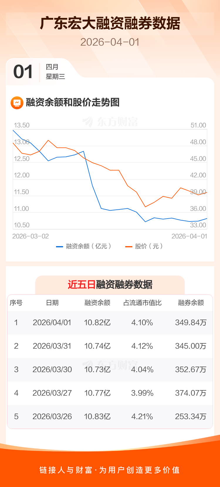 交易所最新数据显示,广东宏大于2026年4月1日获融资买入2318.52万元,融资偿还1502.54万元,当日融资净买入815.98万元。目前,该股融资余额10.82亿,占流通市值比例为4.10%。