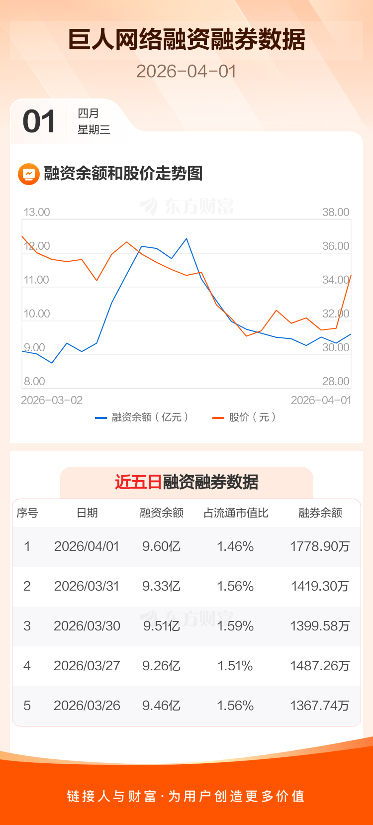 交易所最新数据显示,巨人网络于2026年4月1日获融资买入1.35亿元,融资偿还1.08亿元,当日融资净买入2700.85万元。目前,该股融资余额9.60亿,占流通市值比例为1.46%。