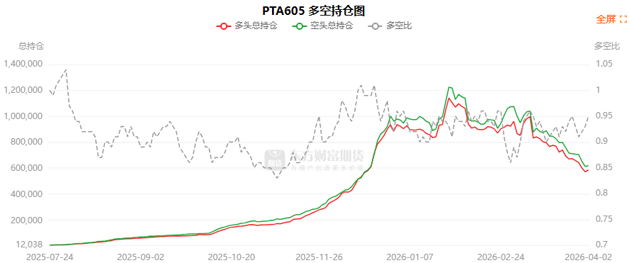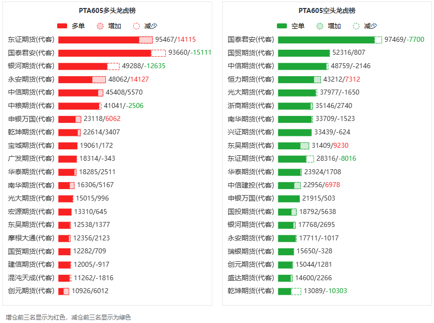 总体而言,PTA605合约今日增仓上行,多空持仓排名前20席中,多空双方均呈进场态势,多头进场意愿强于空头。