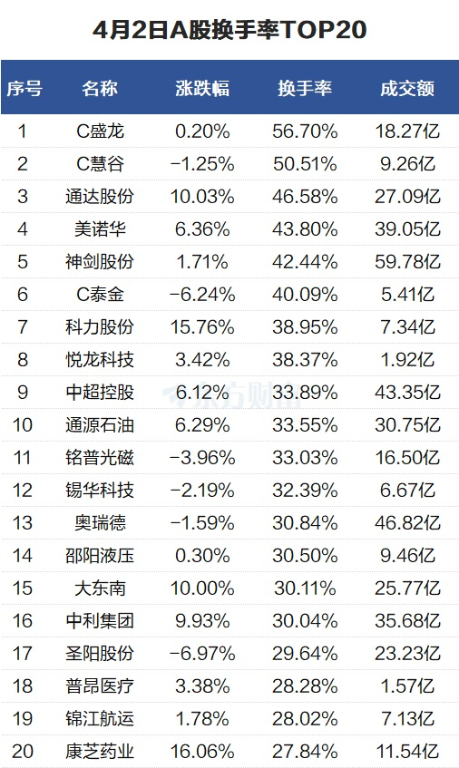 当天换手率最高的个股为C盛龙,全天换手率56.7%。C慧谷紧随其后,全天换手率50.51%。