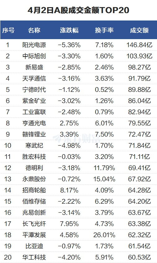 沪深两市成交额1.84万亿元,较上一交易日缩量1695亿元。个股方面,阳光电源当日成交146.84亿元。中际旭创当日成交103.93亿元。