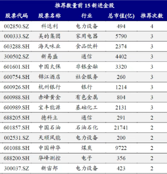 而在4月新进金股(相对2026年3月新进金股名单)中,科达利(002850)被推荐次数最多,合计被推荐了4次。