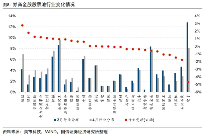 开源证券数据显示,4月金股权重减少最多的行业分别为电子、轻工制造、医药生物,分别减少了6.7%、1.6%、1.3%。国信证券数据显示,电子、石油石化、计算机分别减少了4.70%、1.76%、1.47%。