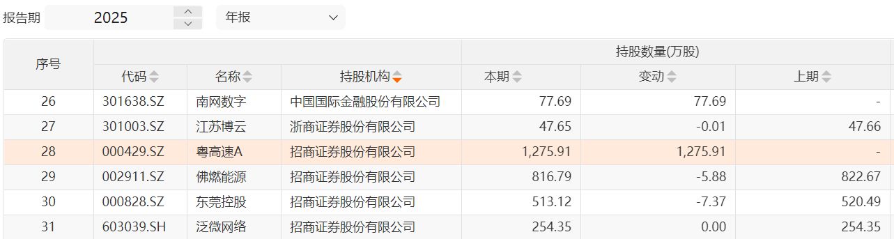 例如2025年年底,招商证券新进粤高速A1275.91万股,这家公司业绩稳健,年化股息率超过4%。国泰海通持有邮储银行1.22亿股、宁沪高速1306.80万股、皖通高速597.95万股;国联民生则持有四川成渝1644.04万股。