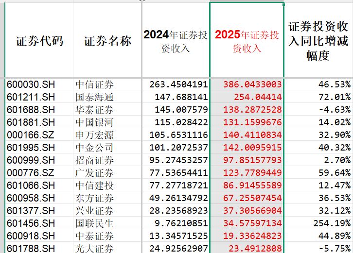 记者用“公允价值变动损益+投资收益-对联营合营企业的投资收益”这一公式,对券商自营投资业绩进行了估算。数据显示,截至目前,已经公布2025年年报的28家上市券商、参股券商的上市公司实现证券投资收入1886.34亿元,同比增长31.39%。