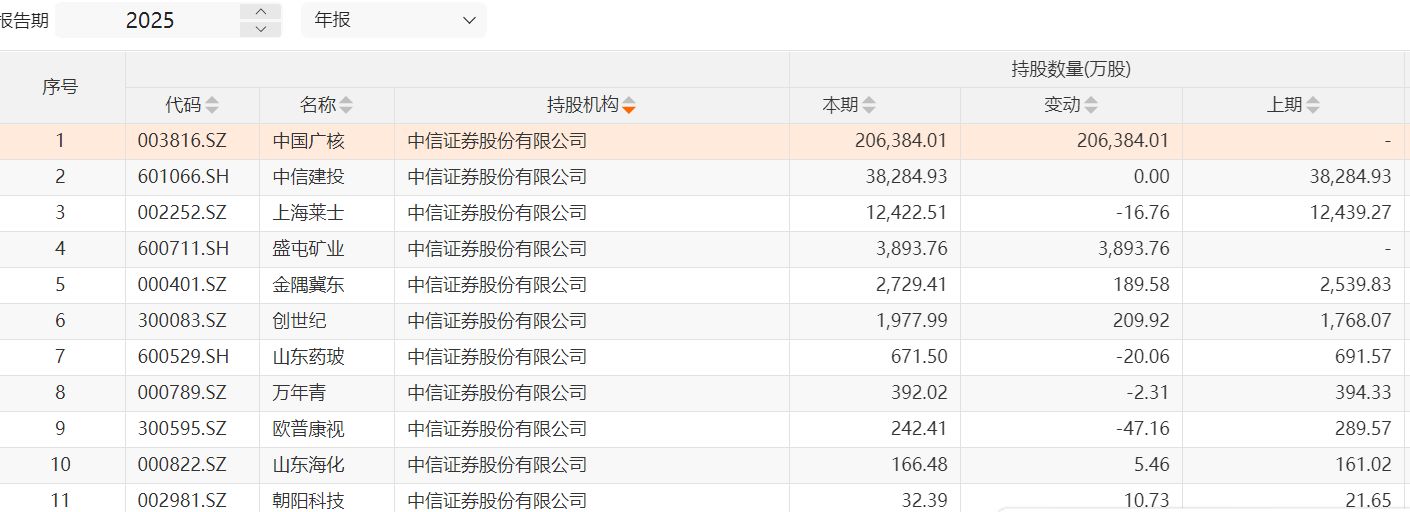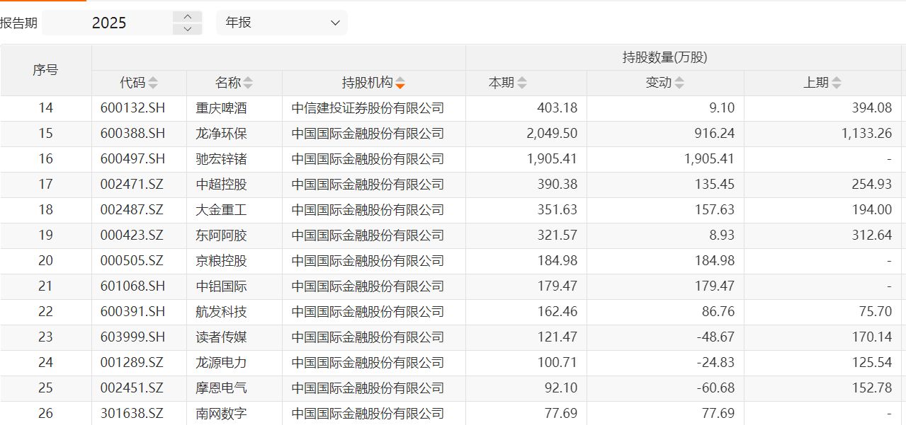中金公司也对周期股进行了布局,新进驰宏锌锗约1905万股、中铝国际179.47万股。截至2025年年末,中金公司合计出现在11家上市公司股东名单中。