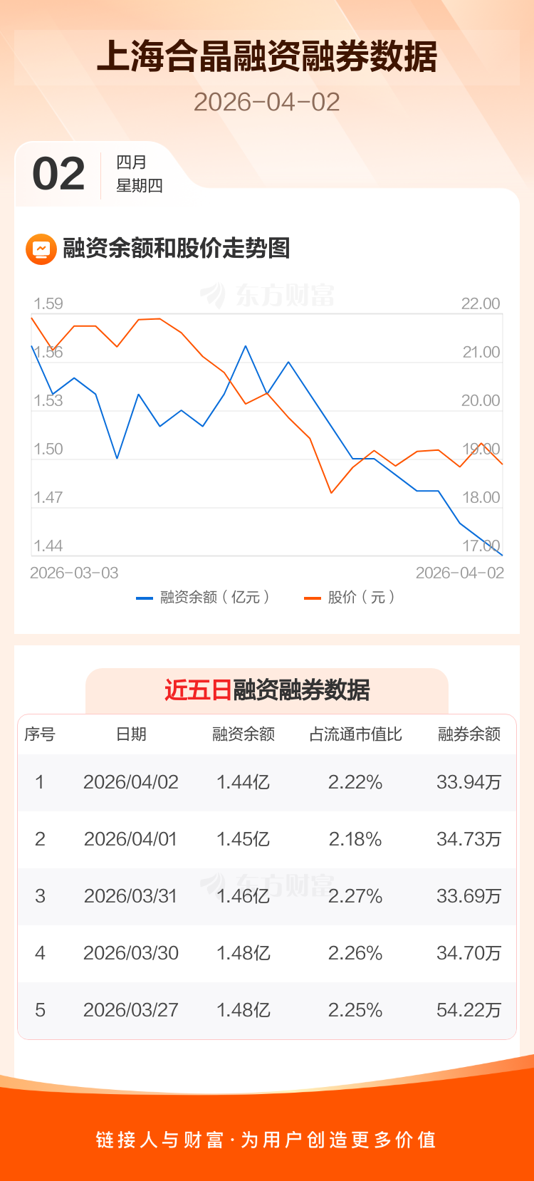 交易所最新数据显示,上海合晶于2026年4月2日获融资买入355.28万元,融资偿还443.43万元,当日融资净偿还88.15万元。目前,该股融资余额1.44亿,占流通市值比例为2.22%。