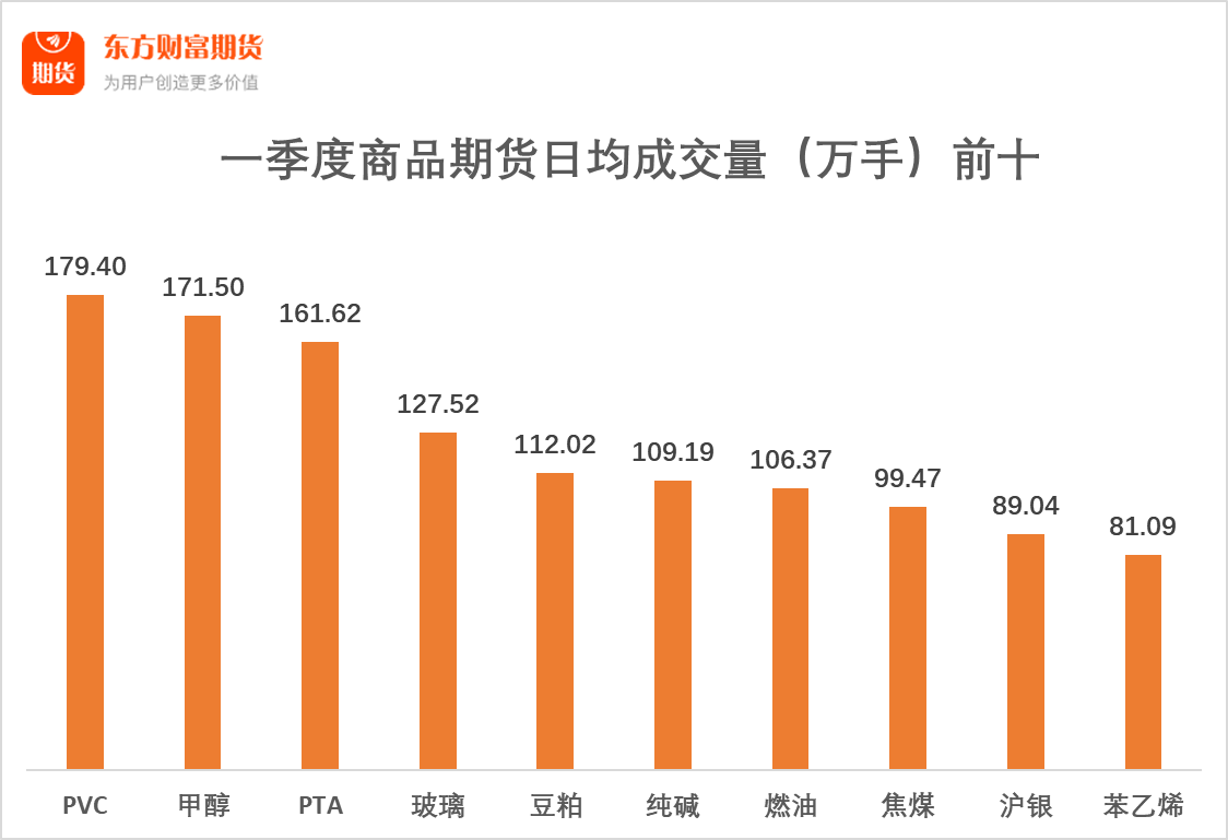 一季度商品期货日均成交量前十中,部分品种活跃度突出。日均成交量高于150万手的品种有PVC(179.40万手)、甲醇(171.50万手)和PTA(161.62万手);日均成交量在100万到150万手之间的品种有玻璃(127.52万手)、豆粕(112.02万手)、纯碱(109.19万手)和燃油(106.37万手);日均成交量低于100万手的品种有焦煤(99.47万手)、沪银(89.04万手)和苯乙烯(81.09万手)。