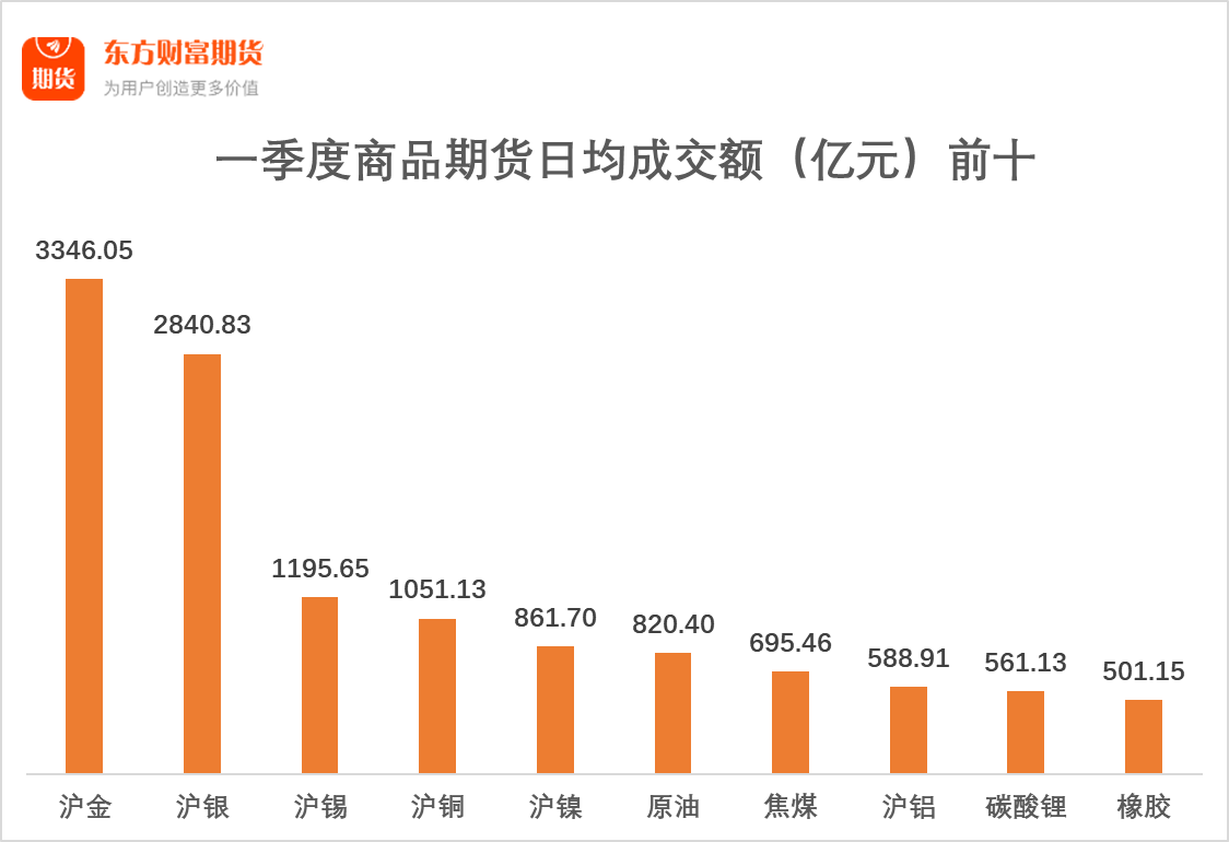 一季度商品期货日均成交额前十中,呈现明显的“贵金属+有色”主导特征。具体来看,沪金(3346.05亿元)、沪银(2840.83亿元)、沪锡(1195.65亿元)、沪铜(1051.13亿元)、沪镍(861.70亿元)、沪铝(588.91亿元)和碳酸锂(561.13亿元)均为贵金属及有色品种;其余三个品种为原油(820.40亿元)、焦煤(695.46亿元)和橡胶(501.15亿元)。
