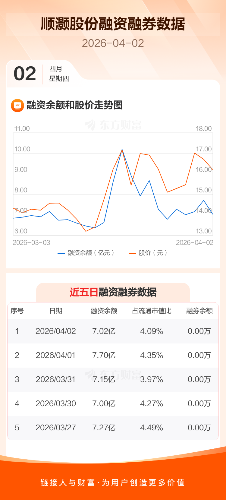 交易所最新数据显示,顺灏股份于2026年4月2日获融资买入1.55亿元,融资偿还2.23亿元,当日融资净偿还6771.21万元。目前,该股融资余额7.02亿,占流通市值比例为4.09%。