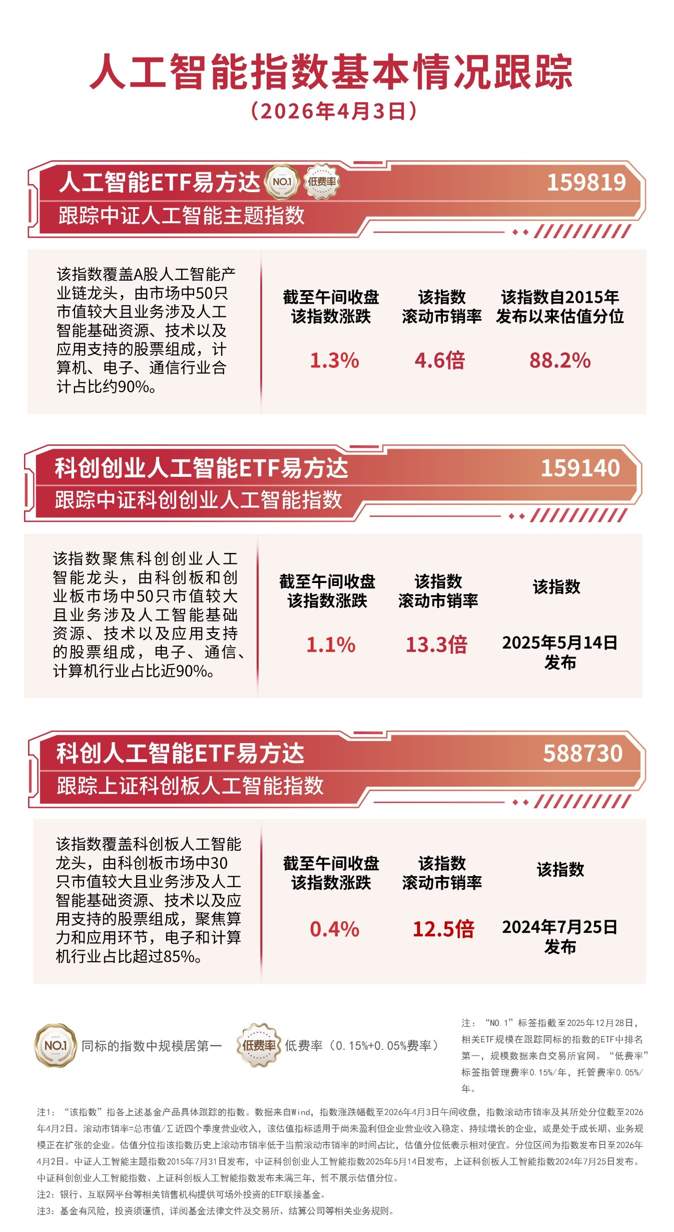 4月3日早盘,AI硬件股率先反弹,光刻机、通信设备、铜缆高速连接等概念走强,截至午间收盘,中证人工智能主题指数上涨1.3%,中证科创创业人工智能指数上涨1.1%,上证科创板人工智能指数上涨0.4%。