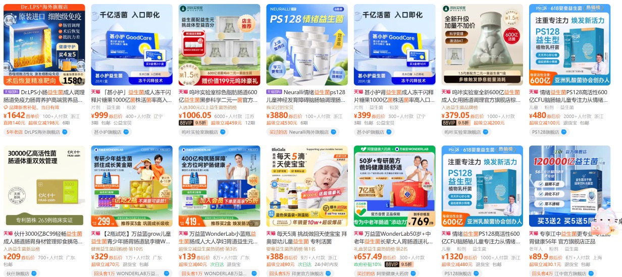 但国标的缺失让行业处于野蛮生长阶段。记者在电商平台上看到,各种剂型、功能的益生菌产品琳琅满目,但大部分益生菌产品仍以压片糖果或固体饮料的身份亮相,价格也天差地别。以常见的肠道益生菌为例,最小包装单价从3元/条到百元/条,相差数十倍。