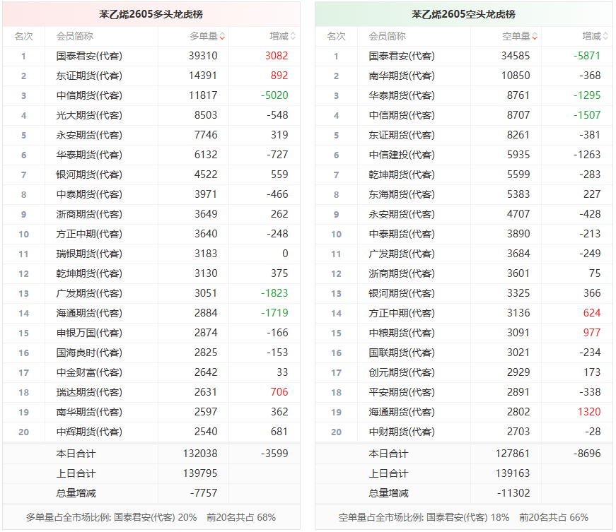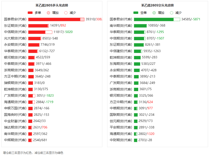 苯乙烯龙虎榜 | 主力合约今日减仓上行 多空双方均呈退场态势