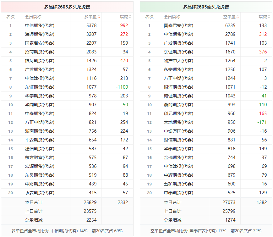 总体而言,多晶硅2605合约今日增仓下行,多空持仓排名前20席中,多空双方均呈进场态势,多头进场意愿强于空头。
