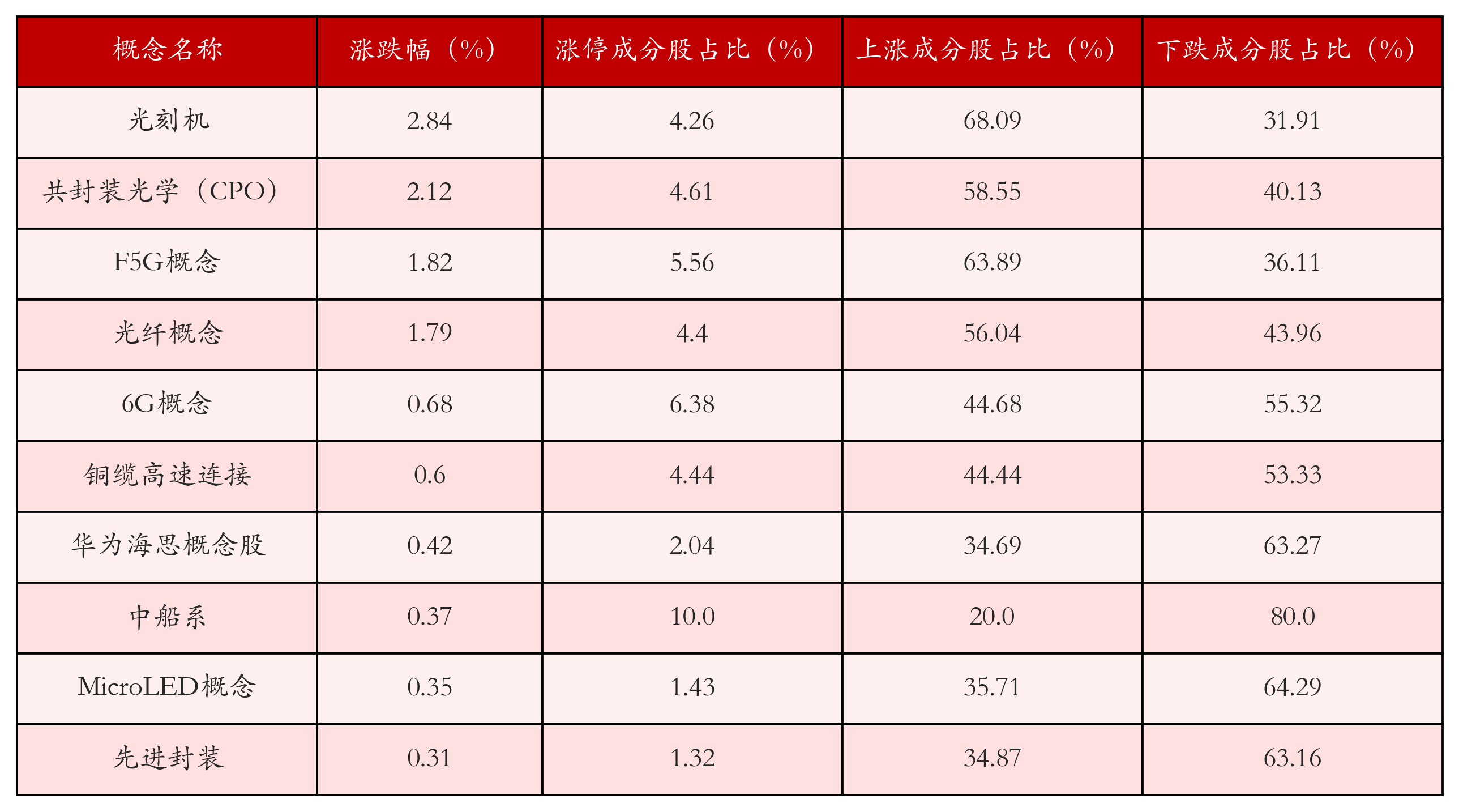 根据A股概念涨跌幅与所对应的股票池综合分析,涨幅靠前的三个概念板块分别为:光刻机、共封装光学(CPO)与F5G概念。排名前10位的概念板块相关数据见下表: