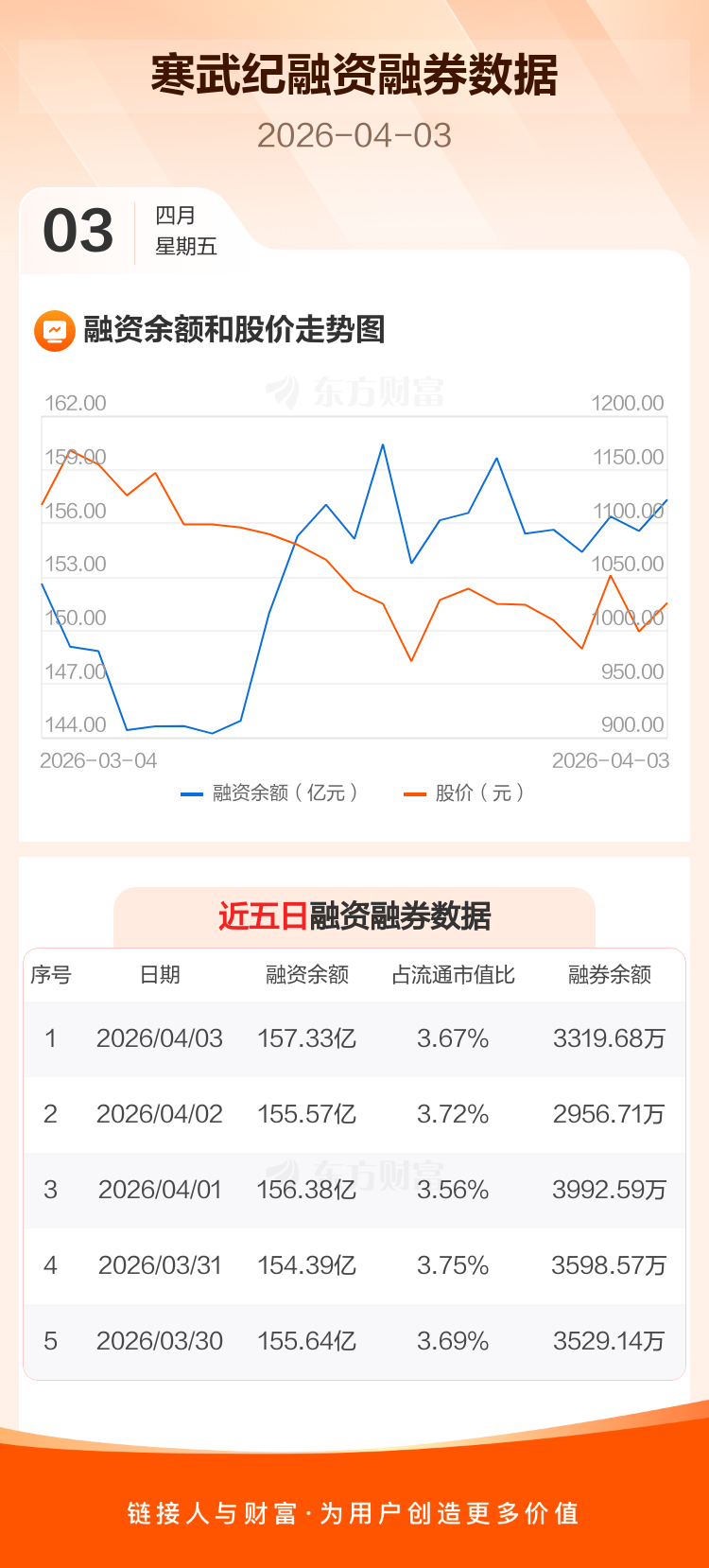 交易所最新数据显示,寒武纪于2026年4月3日获融资买入8.51亿元,融资偿还6.74亿元,当日融资净买入1.77亿元。目前,该股融资余额157.33亿,占流通市值比例为3.67%。