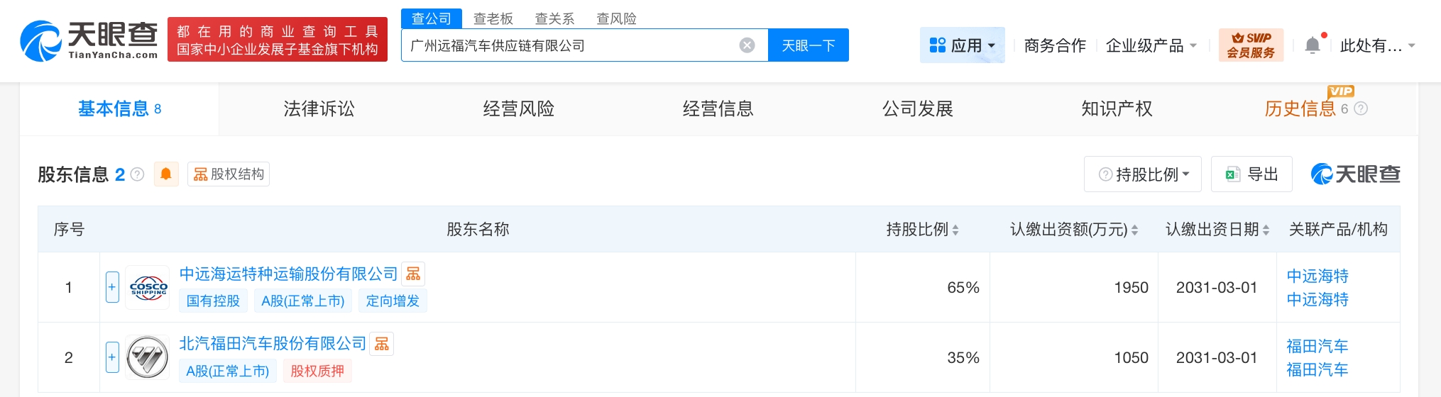 南方财经4月7日电,天眼查工商信息显示,近日,广州远福汽车供应链有限公司成立,法定代表人为杜笑天,注册资本3000万人民币,经营范围包括供应链管理服务、国际货物运输代理、无船承运业务、从事国际集装箱船、普通货船运输等。股东信息显示,该公司由中远海特(600428)、福田汽车(600166)分别持股65%、35%。