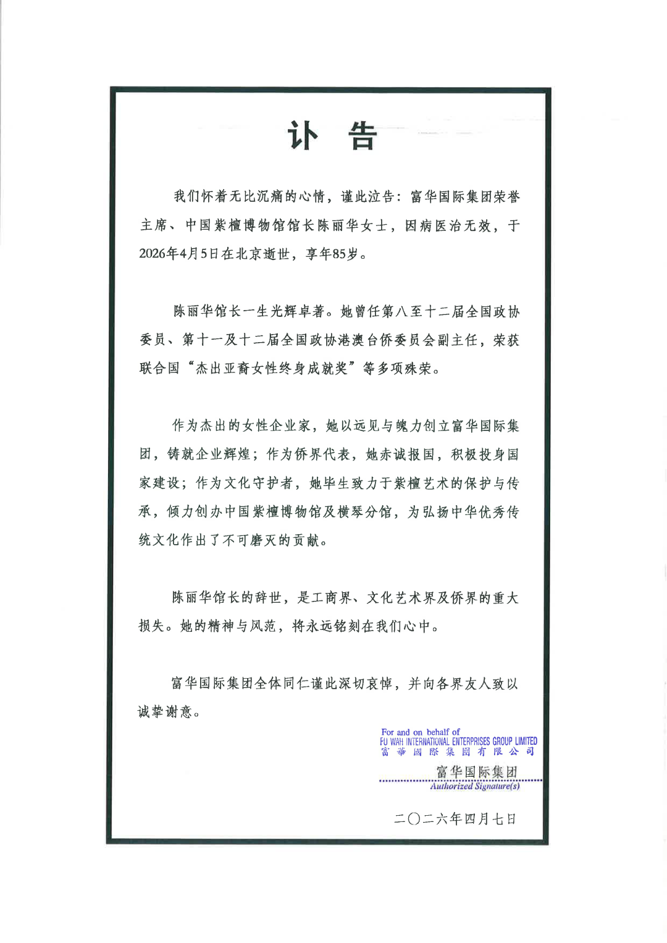 4月7日,富华国际集团发布讣告,富华国际集团荣誉主席、中国紫檀博物馆馆长陈丽华女士,因病医治无效,于2026年4月5日在北京逝世,享年85岁。