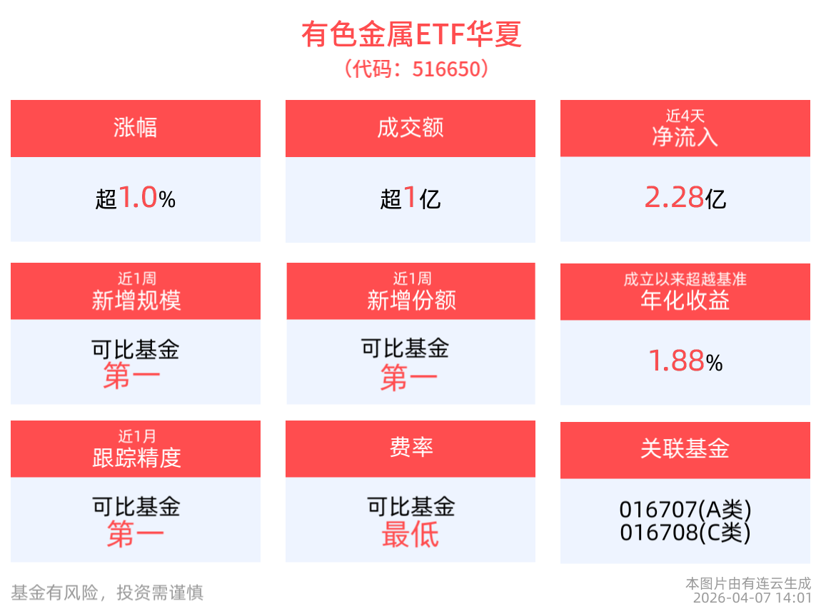 截至2026年4月7日 ,稀土、铝概念午后异动,截至14:01,有色金属ETF华夏(516650)上涨1.04%,其持仓股中稀有色涨停,盛和资源上涨5.82%,天山铝业上涨5.55%,中孚实业,北方稀土等个股跟涨。统计显示,有色金属ETF华夏(516650)近4个交易日内有3日资金净流入,合计“吸金”2.28亿元。