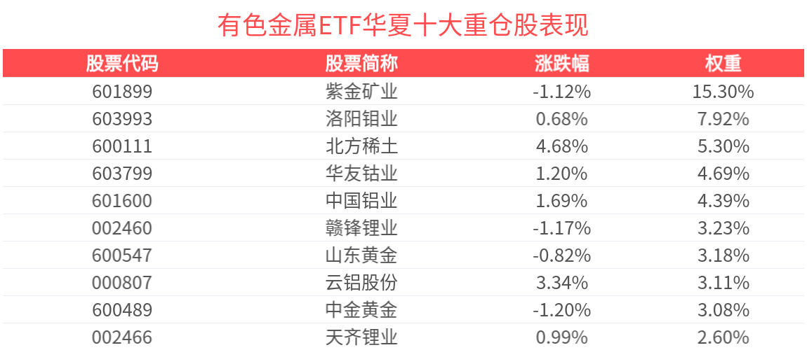 有色金属ETF华夏紧密跟踪中证细分有色金属产业主题指数,截至2026年3月31日,指数前十大权重股分别为紫金矿业、洛阳钼业、北方稀土、中国铝业、华友钴业、赣锋锂业、中金黄金、山东黄金、赤峰黄金、云铝股份,前十大权重股合计占比50.78%。