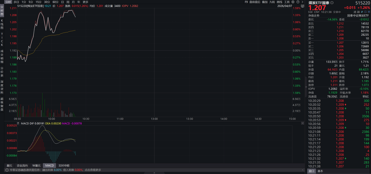 煤炭ETF(515220)盘中大涨1.5%,作为全市场唯一跟踪中证煤炭指数的ETF产品,覆盖动力煤、焦煤及煤电一体化龙头企业,兼具能源替代弹性和高股息防御属性,是把握本轮能源联动的核心工具。