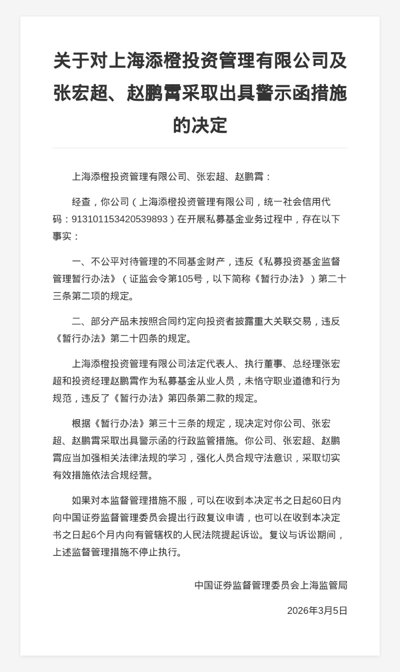 对此,中国证券监督管理委员会上海监管局决定对上海添橙投资管理有限公司、张宏超、赵鹏霄采取出具警示函的行政监管措施。
