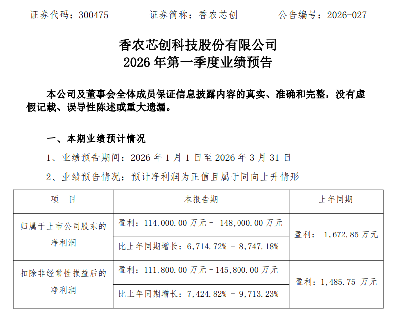 香农芯创4月7日公告,预计一季度归母净利润11.4亿元–14.8亿元,同比增长6714.72%-8747.18%,上年同期盈利1672.85万元。在生成式人工智能(AGI)应用需求蓬勃增长的强劲驱动下,行业景气度持续上行,企业级存储产品价格持续上涨,公司盈利能力持续改善,利润水平大幅提高。