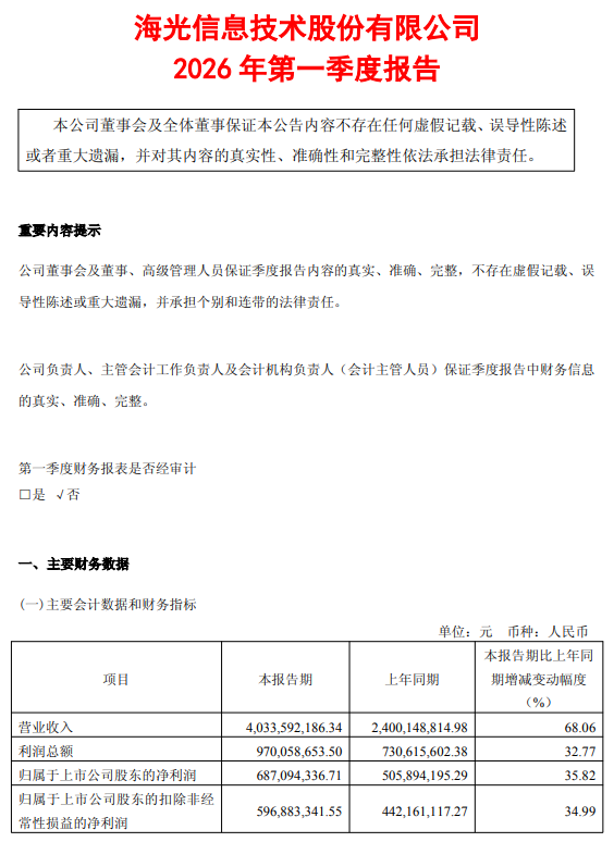 海光信息4月7日公告,2026年第一季度实现营业收入40.34亿元,同比增长68.06%;归属于上市公司股东的净利润6.87亿元,同比增长35.82%;基本每股收益0.3元。