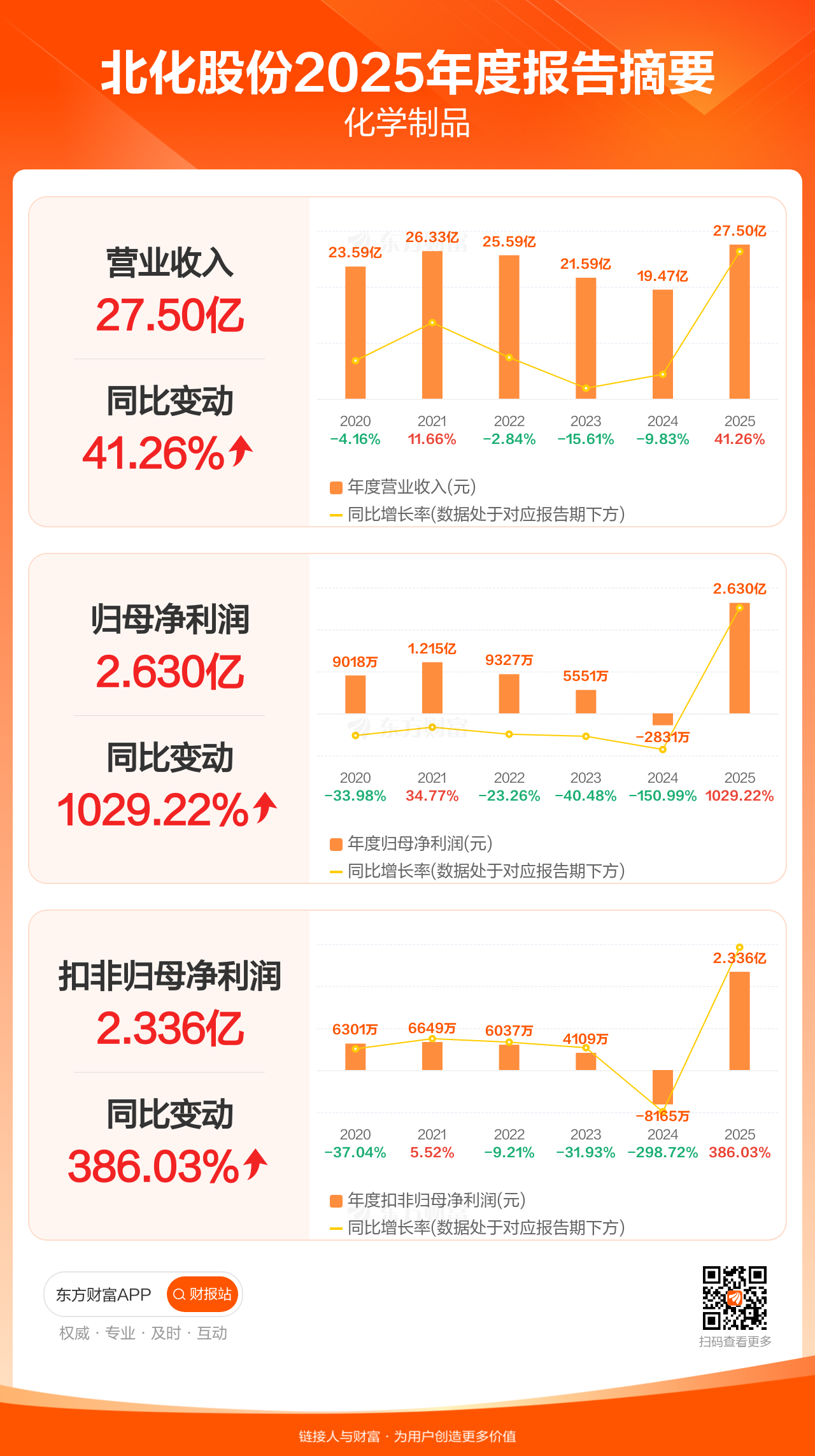 北化股份4月8日发布2025年年报显示,公司全年实现营业收入27.50亿元,同比增长41.26%;归母净利润2.63亿元,同比增长1029.22%;扣非归母净利润2.34亿元,同比增长386.03%。