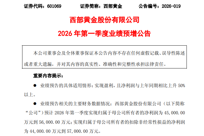 西部黄金4月7日发布业绩预告,预计2026年第一季度实现归母净利润4.5亿元到5.6亿元,与上年同期(追溯调整后)相比,增加1797.16%到2260.91%。西部黄金表示,报告期内公司黄金产品销量较上年同期增加、销售价格较上年同期上升以及电解锰的销售价格较上年同期上升。