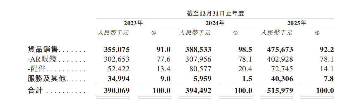 XREAL的收入来自AR眼镜销售、配件销售和技术服务,其中公司九成以上的收入都来自AR眼镜的销售。2025年,公司总营业收入5.16亿元,其中AR眼镜销售收入4.03亿元。