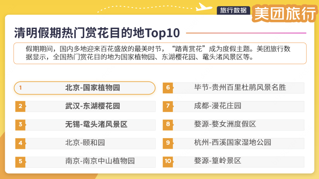 假期期间,国内多地迎来百花盛放的最美时节,“踏青赏花”成为度假主题。美团旅行数据显示,全国Top10赏花目的地为国家植物园、东湖樱花园、鼋头渚风景区、颐和园、南京中山植物园、贵州百里杜鹃风景名胜区、漫花庄园、婺女洲度假区、西溪国家湿地公园、篁岭景区。