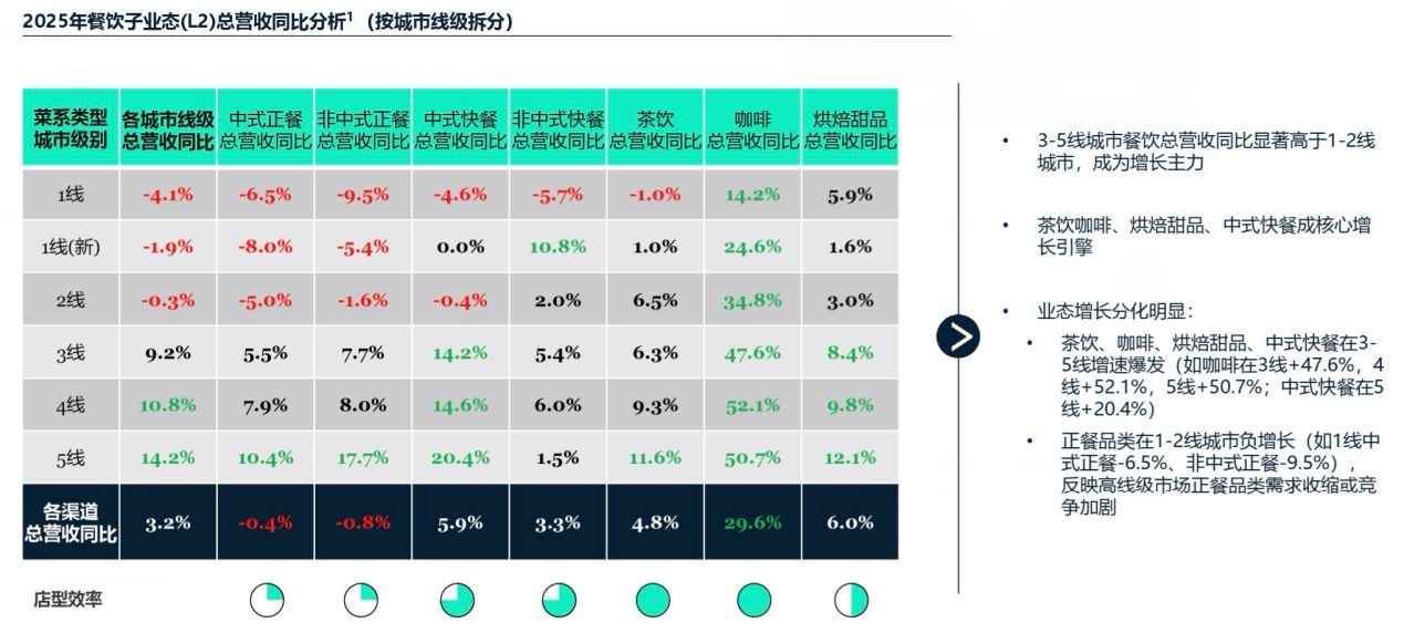“中国餐饮业呈现极端的市场分化与赛道错位:存量博弈困于高线城市,增量红利加速向低线城市与咖啡赛道聚集,高效店型业态的发展显著高于正餐业态。”杨顺展示的图表显示,一线及新一线城市餐饮增长已呈“红色”低迷状态,而三四五线城市仍保持积极增长。品类方面,中式正餐、快餐在一二线城市整体下滑,但咖啡赛道全线逆势大涨近30%,成为最引人注目的增长极。
