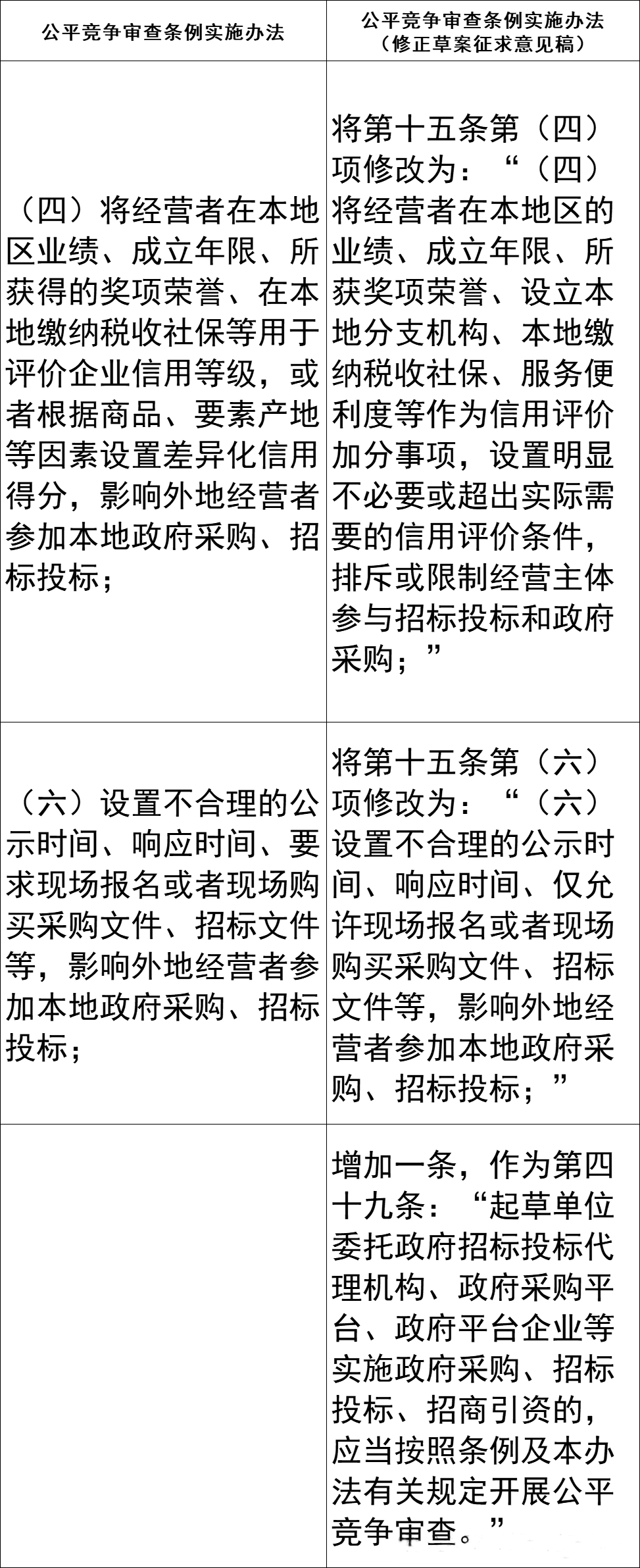 近日,国家市场监督管理总局对《公平竞争审查条例实施办法》进行修改完善,形成了修正草案征求意见稿。修正主要围绕健全审查机制、规范审查程序、强化监督保障等方面对《实施办法》进行修改完善,共作出12处修正、新增2条规定,其中涉及招标采购的内容请见下方对比图: