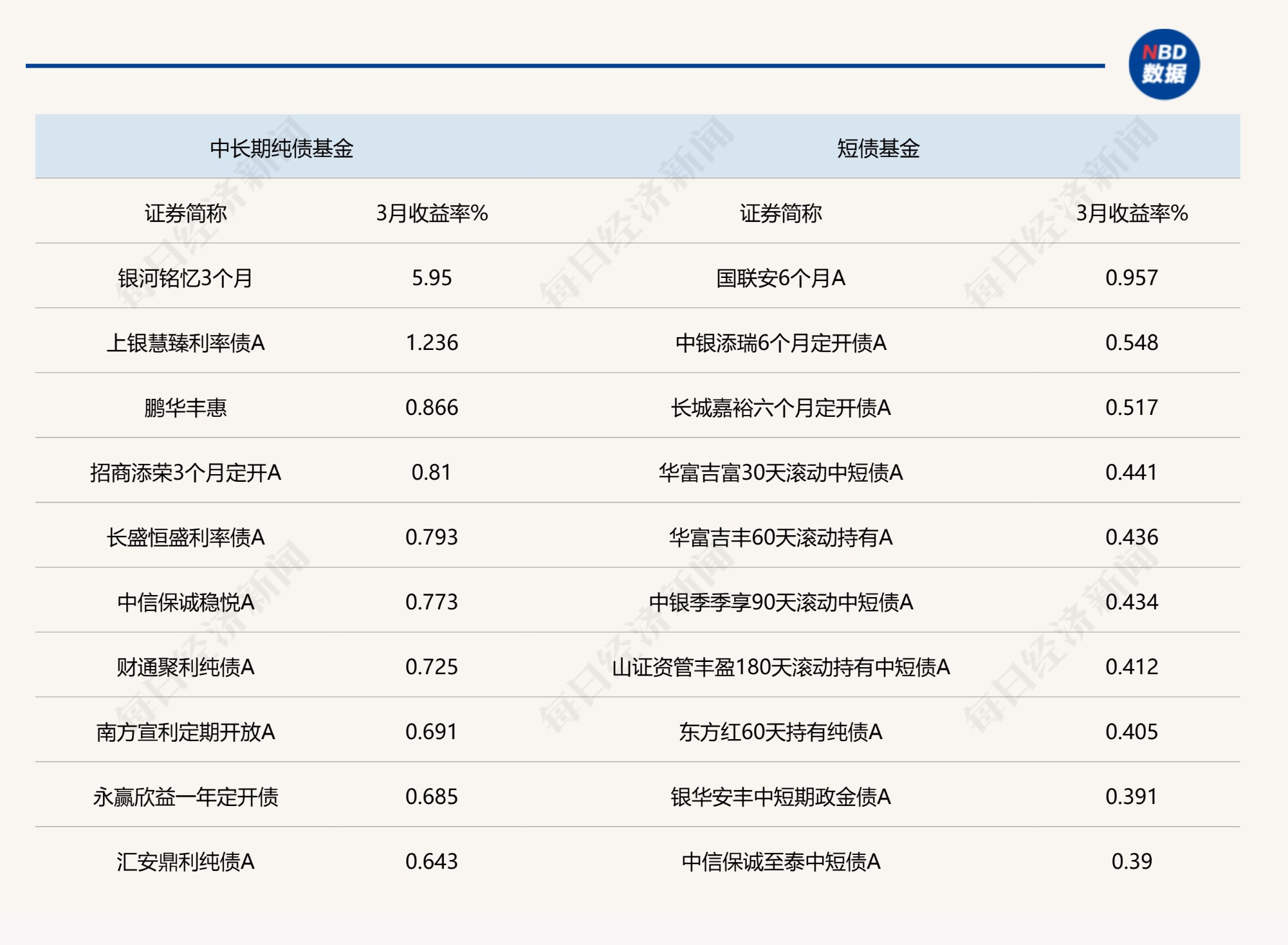 说明:3月公募债基头部业绩产品统计