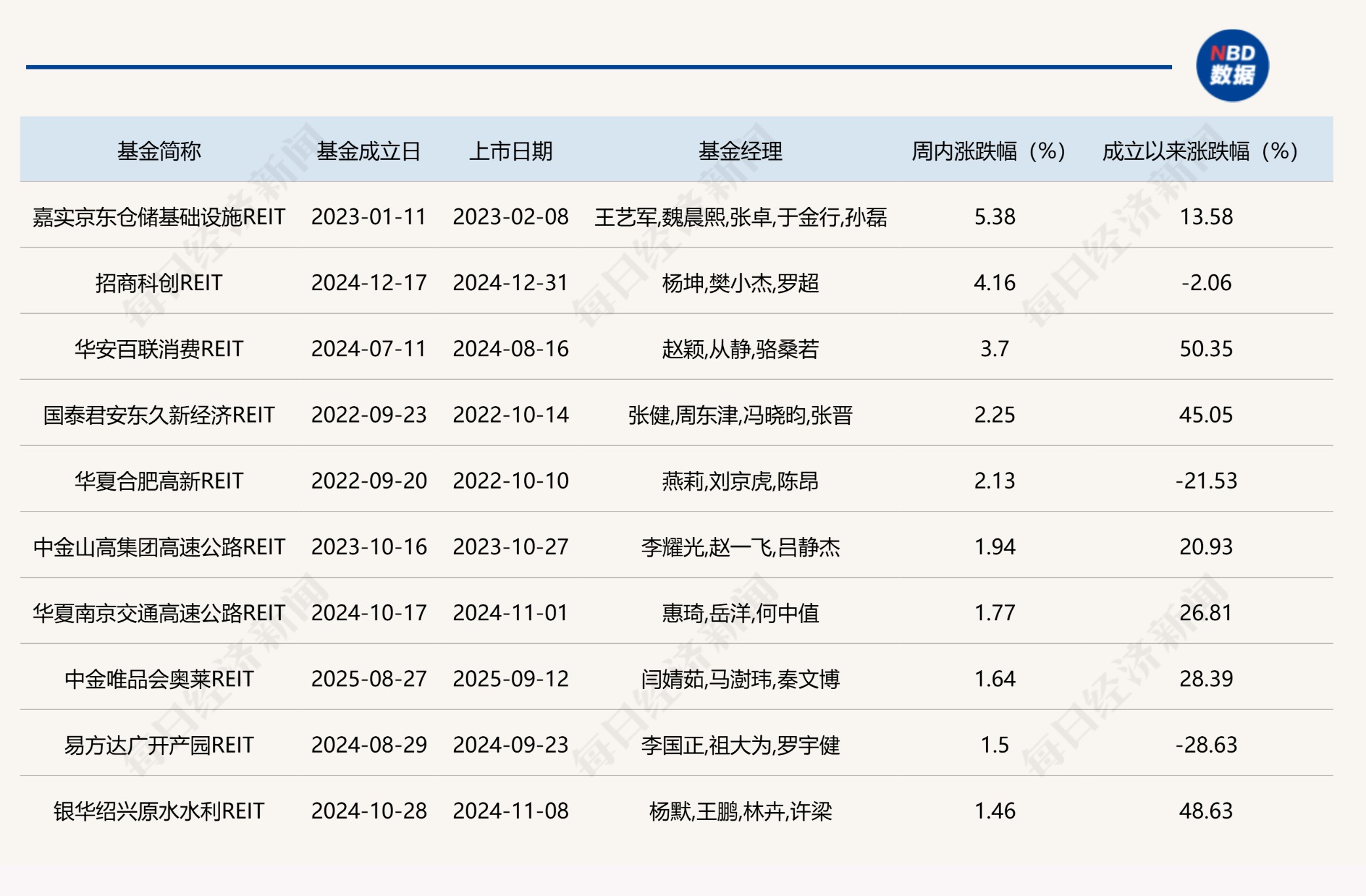 上周涨幅排名前十的公募REITs